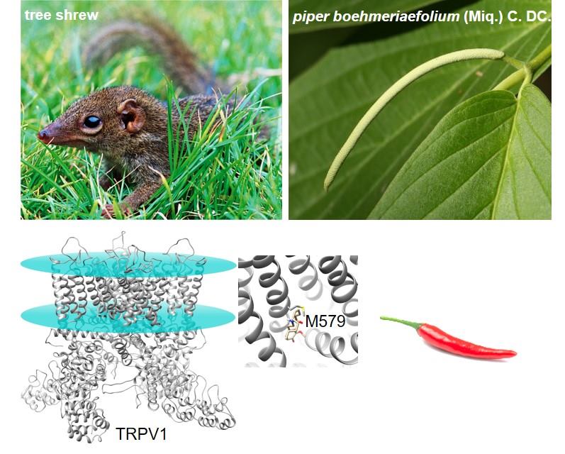 5个种群155个野生树鼩个体的测序结果表明,579位点的突变发生在种上水平。而辣椒引入东南亚地区仅有300年历史,无法引起种上水平的基因突变。然而,研究人员发现,树鼩偏好食用一种广泛生长在东南亚地区的胡椒属植物——芦子藤,芦子藤富含一种辣椒素类似物——Cap2,使这一植物具有“辣”的特性。实验结果显示,树鼩TRPV1对Cap2的敏感性仅有小鼠的千分之一,而将树鼩TRPV1 579位点的甲硫氨酸突变成苏氨酸可以使树鼩TRPV1对Cap2的敏感性上升1000倍。研究人员综合行为学、生化分析、进化学分析、电生理功能和结构模拟等方面的实验数据,揭示了芦子藤中的辣椒素类似物Cap2分子作为树鼩TRPV1 579位点突变的环境压力,降低树鼩对辛辣食物的敏感性,使树鼩具有更为广泛的食谱从而获得更强的生存适应能力。
