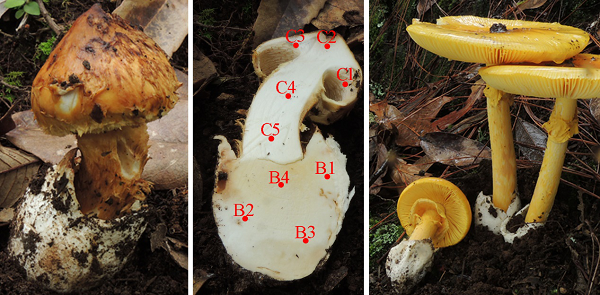 图1 寄主美丽菌瘿伞(Squamanita mira)及其宿主黄蜡鹅膏(Amanita kitamagotake)。左图示上部的寄主和基部的宿主,中图示寄主(标记为C)和宿主(标记为B)及“嫁接痕”,右图示健康宿主。