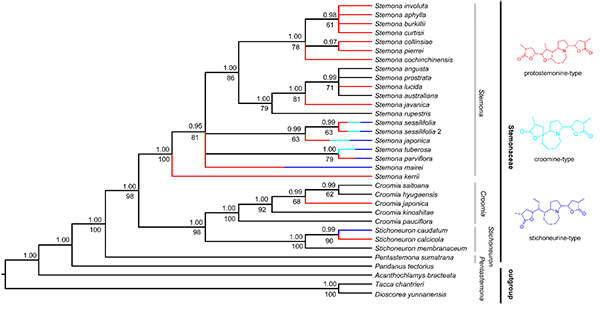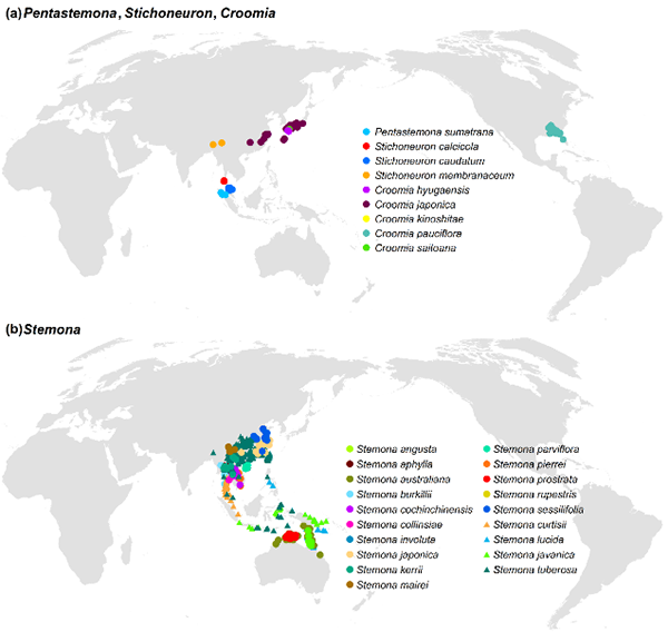 此外,研究团队与北京大学、莱比锡大学等单位合作研究了百部科特殊种子扩散模式对其时空分布格局的影响。结果表明,该类群于晚白垩纪时期起源于亚洲大陆(东亚及中南半岛)并随后扩散至北美、马来群岛及澳大利亚北部。无脊椎动物介导的扩散可能会促使狭域特有现象的发生,对植物类群现代分布格局的形成起着重要作用。百部科不同类群扩散模式的差异深刻地影响了该科的生物地理过程。尽管经历了漫长的演化历史(从白垩纪至今),由于受限于蚂蚁的扩散能力,绝大多数百部科物种不能跨越海洋的阻隔,为狭域特有类群,以其祖先起源地为多样化中心,局限分布于其分布区内的大陆上,不能扩散到大陆周边的岛屿。而胡蜂具有很强的扩散能力,可以跨越生物地理屏障,占据更为广阔的分布区,大陆及其周边岛屿甚至是彼此隔离的马来群岛中均可见这些类群的分布。陆桥的连接作用及季风气候的发展可能促使了胡蜂传播植物类群的成功扩散。该研究为我们理解无脊椎动物介导的扩散如何影响植物生物地理过程及现代分布格局形成提供了新的视角。也为百部科百部生物碱的多样性分化提供了生物地理学方面的证据。该研究成果以“Invertebrate-mediated dispersal plays an important role in shaping the current distribution of a herbaceous monocot”为题发表于生物地理学期刊Journal of Biogeography上。北京大学陈永生博士,昆明植物研究所曾春霞博士为共同第一作者,昆明植物所蔡祥海研究员和陈高研究员为共同通讯作者。