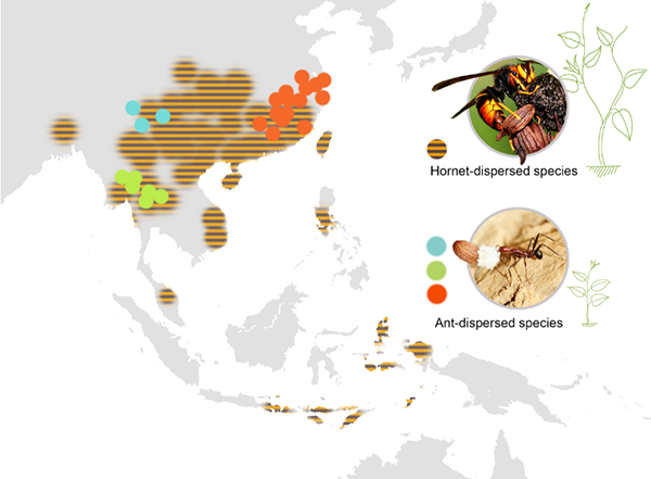 物种扩散是塑造生物多样性分布格局的重要生态和进化过程。植物类群的扩散通常是通过种子或其他繁殖体的散布来实现的,这一过程往往需要诸如风、水流及动物等非生物或生物媒介的参与。植物与种子传播者的协同演化一直是进化生物学家关注的核心科学问题。目前,围绕鸟类和哺乳动物等开展的植物与传播者间的协同演化已有大量研究,但对无脊椎动物在植物种子传播及时空分布格局中扮演的角色的研究则相对较少。