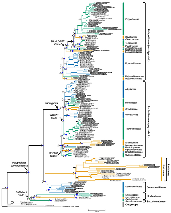 水龙骨目(Polypodiales, 又称为水龙骨类polypods)是现生蕨类植物的核心类群,包括28科253属8700多种,占蕨类物种总数的80%以上。迄今为止,水龙骨目内科级关系仍未得到解决或支持不足,主要谱系的起源、分化时间估算仍具很大争议。中国科学院昆明植物研究所李德铢研究员带领的研究团队近年来致力于维管植物的植物系统发育基因组学研究。该团队联合美国密苏里植物园Li-Bing Zhang教授、美国史密森尼研究院国家自然历史博物馆的Jun Wen教授、台湾清华大学的Li-Yaung Kuo博士、巴西里约热内卢植物研究所的Claudine M. Mynssen博士和西双版纳热带植物园的Harald Schneider研究员等,对水龙骨目全部28科109属(43%的属)208种进行取样,利用第二代测序技术新获取27科100属160种的质体基因组序列。在重新评估中国东北地区早白垩纪水龙骨类化石和缅甸白垩纪水龙骨类琥珀化石的基础上,利用系统发育基因组学方法和多种分析策略,包括罚分似然算法和贝叶斯推断算法以及三种不同的分子定根策略的组合,对水龙骨目的科级系统发育关系进行重建、并对其早期演化历史进行推演。