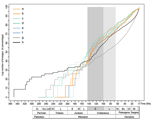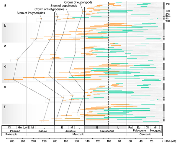 研究表明,基于质体基因组的系统发育分析较好地解析了水龙骨目深层系统关系,其6个亚目(主要分支)和绝大多数科间关系均获得高度支持(图1)。六种不同分析所展现的水龙骨目早期多样化模式大体一致(图2);不同分析策略主要对水龙骨目最深层节点的时间估算产生显著影响,而对核心的真水龙骨类(eupolypods)的分化时间估算影响不大(图3)。总体来看,水龙骨目的起源可追溯至三叠纪,主要分支在侏罗纪均已出现;侏罗纪晚期至早白垩纪时期水龙骨目的演化速率明显升高,真水龙骨类发生辐射演化,其大部分科在这一时期起源(图2和3)。通过比较水龙骨目和被子植物(Li et al. 2019. Nature Plants)的早期多样化模式,推测水龙骨目和被子植物在白垩纪陆地革命(Cretaceous Terrestrial Revolution)前期同时发生多样化,两者的起源时间均应早于白垩纪。