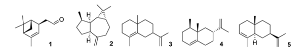 图1 沉香碳垫菌(Nemania aquilariae)挥发成分的化学结构。(1) Bi-cyclo[3.1.1]hept-3-ene-2-acetaldehyde, 4,6,6-trimethyl-, (1R,2R,5S) rel-;(2) Alloaromadendrene;(3) Naphthalene,1,2,3,4,4a,5,6,7-octahydro-4a,8-dimethyl-2-(1-methylethenyl)-;(4) Valencen;(5) α-Selinene。