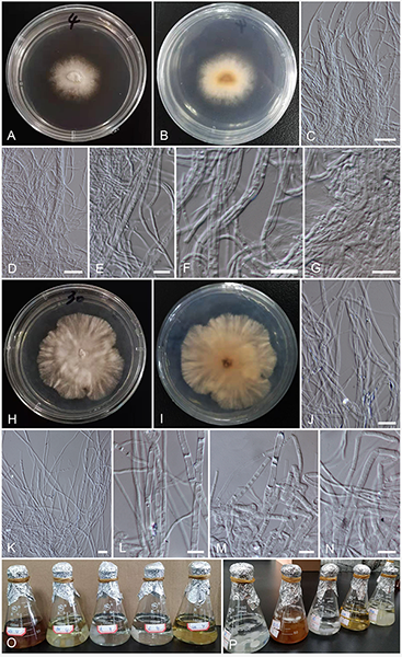 图2 云南碳垫菌(KUMCC20-0267, ex-type)和沉香碳垫菌(KUMCC20-0268, ex-type)的纯培养物、菌丝形态和五种发酵培养液。