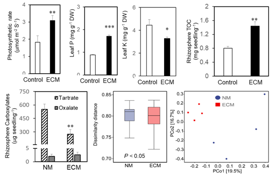 图2. 蒙古栎-黑孢块菌外生菌根促进宿主植物光合效率、磷吸收、根际总有机碳含量,减少钾吸收和有机酸分泌,并改变根际细菌群落结构。