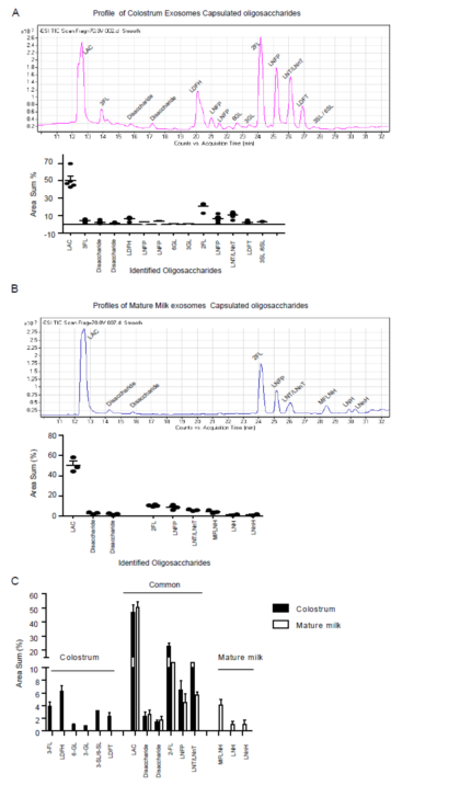 外泌体 (尺寸为40 ~ 150 nm)、微泡和多囊泡内体 (MVE) (尺寸为100 ~ 1000 nm) 是不同形式的细胞外载体 (EV),它们是从细胞内体腔分泌的小包膜颗粒。 EVs 大量存在于人体体液中,例如血液、尿液、母乳和唾液。外泌体的分泌受到严格控制,它们在细胞间通讯、细胞内运输和生理调节中发挥关键作用。外泌体胶囊含有大量生物活性成分,如蛋白质、miRNAs和碳水化合物(糖蛋白)等,执行复杂多样的生理功能,并且通过靶细胞内吞作用的方式,成为靶向细胞特异摄取活性物质的天然方式之一。目前,已经在母乳外泌体中发现了执行生物学功能和调节婴儿免疫系统发育的多种成分,例如免疫调节蛋白、miRNAs等。作为在婴儿肠道粘膜免疫系统的发育中起着关键作用的母乳寡糖,长期以来被认为作为“游离糖”分布于母乳之中。到目前为止,母乳外泌体中关于主要活性成分的母乳寡糖的具体情况知之甚少。