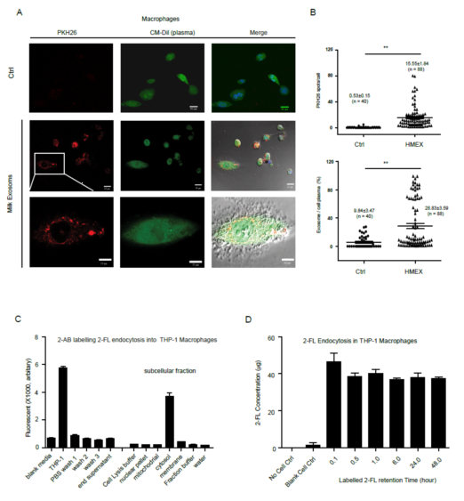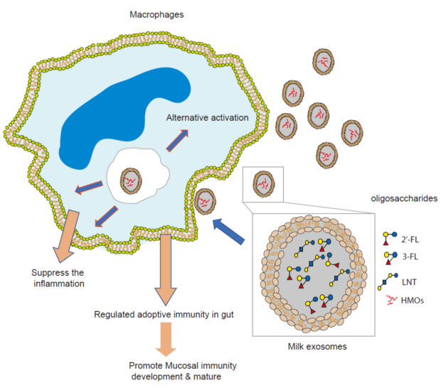 相关研究揭示了母乳寡糖利用外泌体转运到巨噬细胞,解析其调节肠道粘膜免疫系统分化和成熟的关键信号通路,抑制粘附侵袭性大肠杆菌 (AIEC) 感染的新机制。外泌体包裹的母乳寡糖揭示了一种实现母乳寡糖调节新生儿肠道粘膜免疫系统发育的生理机制,为母乳寡糖治疗婴幼儿肠道细菌感染性疾病采用外泌体样颗粒将母乳寡糖运输到其特定细胞的新思路和策略。