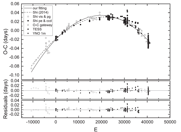 近日,国际天文学杂志《英国皇家天文学会月刊》(Monthly Notices of the Royal Astronomical Society)发表了中国科学院云南天文台双星与变星研究团组博士研究生臧蕾和钱声帮研究员等人对银河系超软X射线源研究的最新成果。该工作基于TESS测光数据,发现超软X射线源天箭座V的连续轨道光变曲线存在奇特的无规律变化,首次揭示了超软X射线源周围很可能存在分布不均匀的星周物质和不规则的物质损失。同时分析了这颗双星的轨道周期变化,在非守恒物质转移的情况下,给出了物质转移率的大致范围。