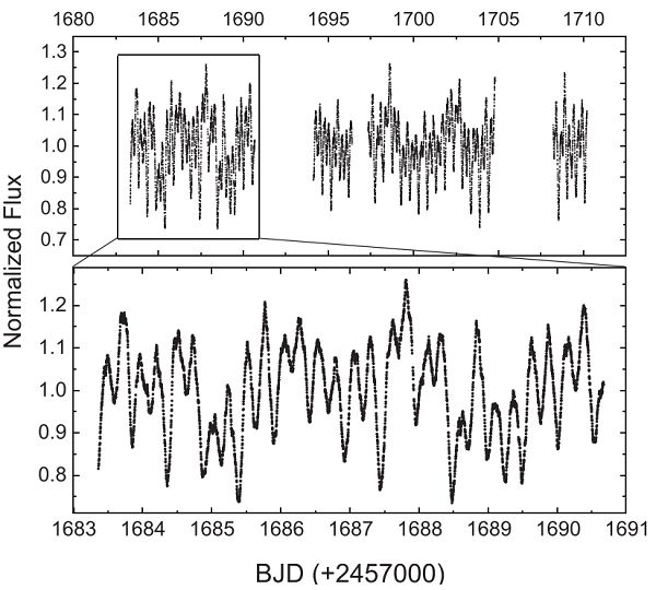 基于对轨道周期变化分析的结果,研究人员得出该系统最新的轨道周期变化率,并考虑在吸积盘风导致系统角动量损失的情况下,估算出物质转移率和物质吸积率的大致范围,且推测该系统中白矮星主星将在至少一百万年后达到钱德拉塞卡质量极限继而很可能爆炸成Ia型超新星。另外,研究人员用空间望远镜TESS观测得的连续光变曲线发现了奇特的无规律的短时标变化(见图3),这或许是由分布不均匀的星周物质的消光影响和/或吸积盘上频繁的活动导致的,这使得研究人员有机会更好地了解超软X射线源的物质转移及物质抛射过程,而这些变化的规律以及更具体的成因仍需进一步研究。