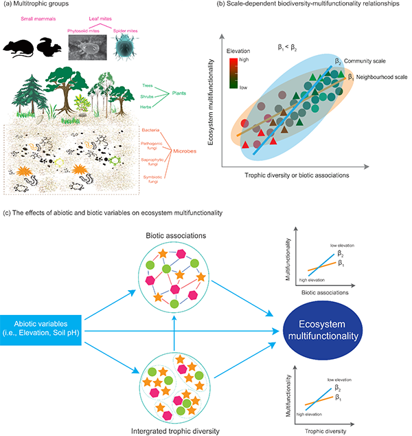 森林生态系统作为重要的陆地生态系统之一,可以提供重要的系列生态系统功能与服务,例如,碳贮存、气候调节、养分循环、凋落物分解及抵抗病虫害等,在维持全球生物多样性及生态系统功能中具有不可替代的作用。然而,在森林群落中,不同营养级(包括动物、植物和微生物)的多样性以及其互作网络如何影响生态系统的多功能性仍不清楚。同时,将空间尺度纳入综合考虑时,生物多样性与生态系统多功能性之间的关系如何发生变化,相关的生态学机制也有待深入研究。