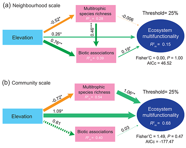 图2 海拔、多营养级多样性和生物相互作用对生态系统多功能性(阈值为T = 25%) 影响的结构方程模型。其中a: 领体尺度; b: 样方尺度。