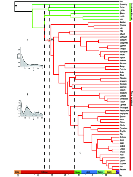 研究结果表明,在天南星科的八个亚科中,裸穗花亚科Gymnostachydoideae是天南星科最早分化出来的类群,随后是奥昂蒂亚科Orontioideae,这两个分支被称为早期天南星科类群。此后,浮萍亚科Lemnoideae与核心天南星科分支发生分化。在核心天南星科分支中,剌芋亚科Lasioideae最早分化出来。石柑子亚科Pothoideae和龟背竹亚科Monsteroideae互为姐妹群,共同组成了两性花攀爬分支(bisexual climbers clade)。美铁芋亚科Zamioculcadoideae和天南星亚科Aroideae互为姐妹群,两者组成了单性花分支(Unisexual-Flowered Clade)。两性花攀爬分支和单性花分支互为姐妹群,共同构成剌芋亚科的姐妹群。基于Ks和基因树方法,发现核心天南星科分支发生了一次共享的ψ(Psi)全基因组加倍(WGD)事件(~100.7-110.5 Ma,大约在海洋缺氧事件OAE1b和OAE 1d时期)(图1)。然而,早期天南星科类群和浮萍亚科没有共享这次WGD事件。并且,天南星科的净多样化最初表现为下降,然后随着时间的推移而增加。研究发现随着核心天南星科干群的分化,多样化速率发生了转移,并在ψ-WGD 后提高了净多样化率。通过功能富集分析,发现在核心天南星科分支中与陆地生活相关的基因,如各种绑定基因,受体和通道活性基因,DNA修复和细胞压力响应基因(如热激蛋白、糖基水解酶、锌指蛋白、果胶乙酰酯酶、细胞色素 P450和氧化应激响应激酶等)发生了扩张。