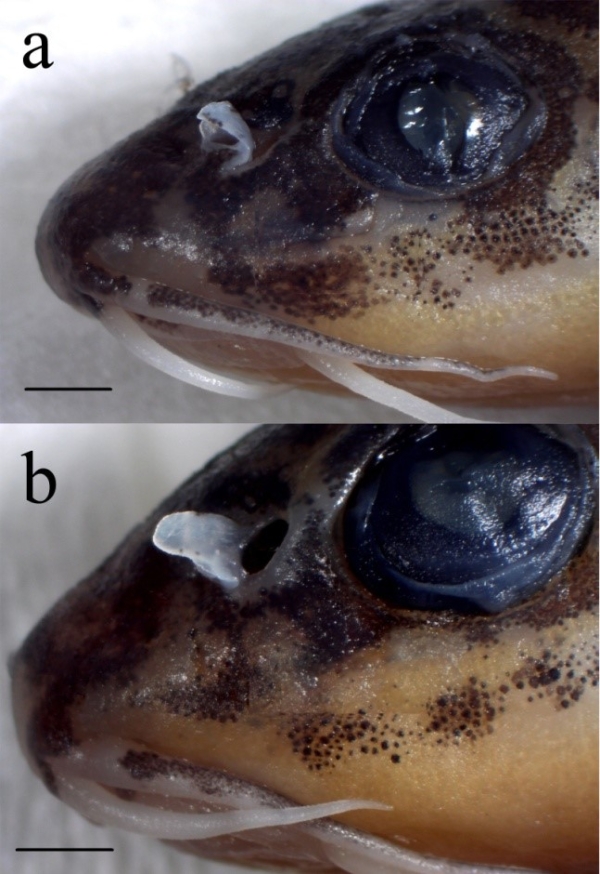 图2. 杨氏迷鳅头部侧面(a为雄性,b为雌性)