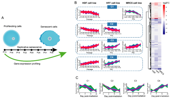 细胞衰老过程是一个由多种因素驱动的动态过程。已有研究通过比较年轻和衰老细胞,发现了细胞衰老相关的转录组特征,但是这些衰老相关信号如何随着衰老过程的推移而改变尚不清楚。鉴于此,中国科学院昆明动物研究所研究员孔庆鹏团队以人皮肤成纤维细胞(HDF)为研究对象,收集了从年轻到复制性衰老过程中8个时间节点的HDF细胞进行转录组测序。基于时间序列表达谱分析,发现细胞衰老过程中,基因的表达模式存在四个动态变化轨迹(C1,C2,C3,C4)。具体表现为,一些基因在细胞增殖过程中线性地上调(C4)或下调(C2),而一些基因则是细胞生长前期保持稳定,直至进入衰老状态才发生表达变化(C1,C3)。进一步功能分析表明,这四种模式的基因参与了不同的生物学途径。考虑到细胞衰老存在的细胞类型和衰老类型异质性,研究人员收集了其他类型复制性衰老细胞(HFF和MRC5)和电离辐射诱导的细胞衰老的时间序列数据集。分析发现,上述四种模式在不同细胞类型的复制性衰老过程中具有保守性,而在不同衰老类型中则存在较大异质性。有趣的是,研究人员发现核糖体和氨基酸分解代谢相关功能在两种类型的细胞衰老过程中都表现出持续减弱的趋势;而细胞周期和碱基修复相关通路在复制性衰老中受到比电离辐射诱导衰老更严格的调控。该研究通过了解细胞衰老的动态变化,为深入理解细胞衰老过程中基因表达模式及变化规律提供了新的认识。