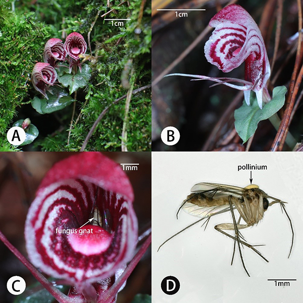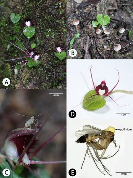 兰科(Orchidaceae)植物极高的物种多样性形成和维持受到多种因素的互作,其中复杂多样的传粉方式是重要的因素。欺骗性传粉,如食源性欺骗、性欺骗和产卵地拟态,或者拟态和报酬并存现象的出现极大地促进了兰花多样性的演化和适应。在兰科欺骗性传粉中,一个重要的传粉系统演化趋势是兰花利用体型微小的双翅目昆虫传粉。小型双翅目昆虫通常是指体长小于5 毫米的小飞虫,包括蠓科(Ceratopogonidae)、秆蝇科(Chloropidae)和蕈蚊科(Mycetophilidae)等。此类体型微小的双翅目昆虫传粉的兰花主要集中在新热带的腋花兰亚族(Pleurothallidinae)和澳大利亚的双尾兰族(Diurideae)。在双尾兰族中,一些种类以真菌为食,或在真菌上产卵的微小型蝇类或蕈蚊作为传粉者,此外,兰花唇瓣上具有腮状纹可能拟态真菌吸引昆虫。然而,以上这些类群中的绝大多数物种缺乏传粉生态学研究,因此小型双翅目在兰科植物传粉中的重要性被低估。