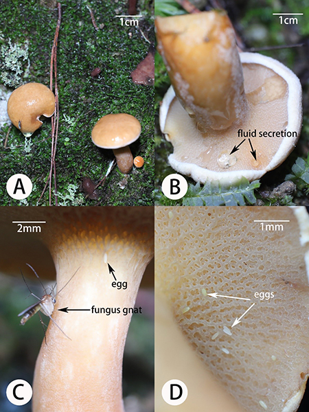 图2. 在双凸铠兰居群的蘑菇和蕈蚊 A. 乳牛肝菌子实体 B. 乳牛肝菌背面的分泌物 C. 蕈蚊及其卵 D. 蕈蚊卵