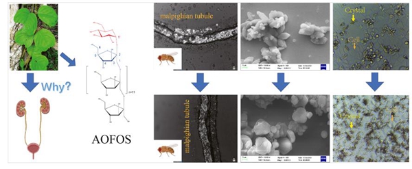 中国科学院西双版纳热带植物园(以下简称“版纳植物园”)博士后研究人员孙朋与其合作者通过对倒心盾翅藤的炎症、氧化损伤、细胞修复和抑制结石形成等多个角度的研究,发现一种高效抑制结石生长的活性成分;经色谱、核磁共振、凝胶色谱等方法鉴定该活性成分为一个葡萄糖残基以beta键连接13个果糖残基的长链粉型果聚糖Aspidopterys Obcordata Fructo-OligoSaccharide(AOFOS)。通过化学、细胞模型和动物模型探究性评价了AOFOS治疗泌尿结石机理为抑制草酸钙结晶和生长,其过程表现为抑制晶体体积和生长速率,并诱导草酸钙晶体由COM (一水草酸钙) 晶体向COD(二水草酸钙)晶体的转化;体内(果蝇)肾结石实验进一步证实:AOFOS诱导马氏管内较小草酸钙晶体的形成,从而更容易排除体外,进而抑制草酸钙晶体在体内的堆积和泌尿系统堵塞。