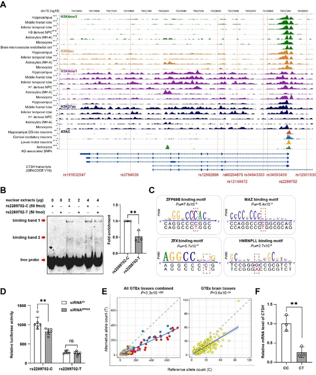 前期,中国科学院昆明动物研究所研究员姚永刚团队在我国早发及家族性AD患者中,发现多个国人特异的与AD风险相关的稀有变异位点(Natl Sci Rev 2019)。进一步分析发现,溶酶体组织蛋白酶基因CTSH的稀有异义变异rs2289702在我国人群中展现出AD发病的保护效应,其效应在欧洲人群也得到验证,是不同人群共有的AD保护性变异。CTSH基因在AD病人脑组织中呈现高表达趋势。在AD小鼠模型中,该基因表达水平与Aβ斑块沉积、tau蛋白过度磷酸化水平正相关。对该变异开展的功能基因组学分析和细胞实验表明,rs2289702是一个调控性变异位点,能够影响转录因子ZPF69B与CTSH基因启动子区结合,从而下调CTSH基因表达。机制研究发现,敲除CTSH可以促进小胶质细胞吞噬Aβ42的能力。这些结果提示,由rs2289702变异导致的CTSH低水平表达是该变异对于AD发病具有保护性效应的一个原因;干预CTSH表达水平,是有望缓解AD发生的一种方式(Neuropsychopharmacology 2023)。