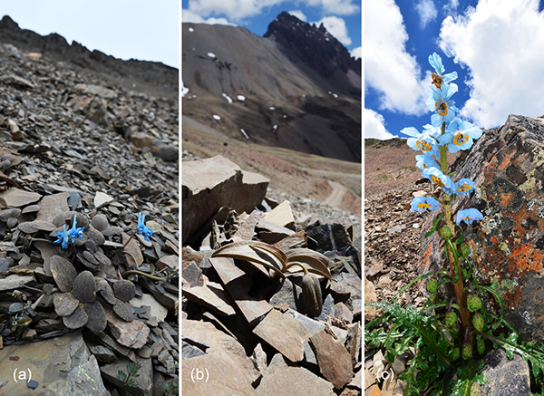 图1 伪装植物:(a)半荷包紫堇(Corydalis hemidicentra)、(b)梭砂贝母(Fritillaria delavayi);非伪装植物:(c)美丽绿绒蒿(Meconopsis speciosa)。