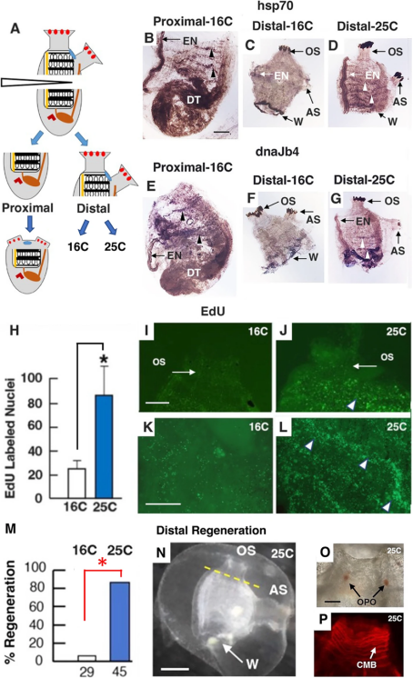 海鞘的再生涉及位于咽部鳃囊脉管系统中的成体干细胞的增殖以及祖细胞向远端损伤部位的迁移。将海鞘身体一分为二后,再生发生在近端片段,但不发生在远端,即使远端包括鳃囊的一部分干细胞。研究团队利用从再生的近端身体片段中获得的鳃囊转录组信息,研究了这种单向再生的分子基础。转录组中上调最明显的基因是编码伴侣蛋白的hsp70以及编码伴侣蛋白相关蛋白的dnaJb4和bag3,其在鳃囊脉管系统中表达,而鳃囊脉管系统之前已被鉴定为干细胞和祖细胞。siRNA介导的基因敲除显示,在再生过程中,hsp70和dnaJb4是祖细胞在损伤部位聚集所必需的,并且热休克可以诱导含有部分鳃囊组织的身体远端片段的完全再生,表明再生依赖于压力反应的激活。压力反应是由远端损伤后鳃囊脉管系统中hsp70、dnajB4和bag3的上调决定的,对于再生至关重要。远端片段中通常不存在压力反应,但热休克可以诱导压力反应,从而激活鳃囊脉管系统中的细胞分裂并促进再生。研究结果表明,热休克可诱导鳃囊脉管中的细胞增殖和海鞘远端组织的完全再生。该研究证明了压力反应对于基底脊索动物干细胞激活和再生的重要性,对于理解其他动物(包括脊椎动物)有限的再生能力具有一定意义。