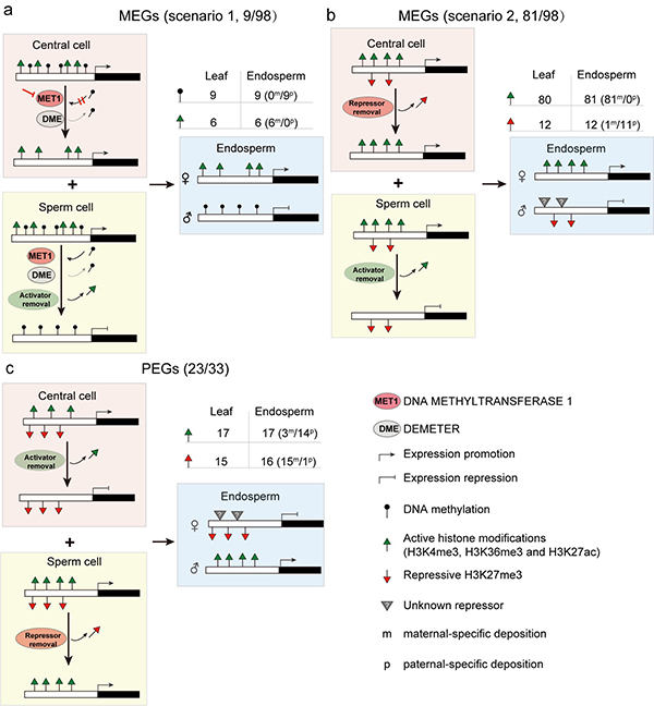 图1:蓖麻基因组印记发生的表观调控模式。(a)DNA甲基化对9个母源印记基因(maternally expressed genes, MEGs)的调控模式;(b)组蛋白修饰对MEGs的调控模式;(c)组蛋白修饰对父源印记基因(paternally expressed genes, PEGs)的调控模式。