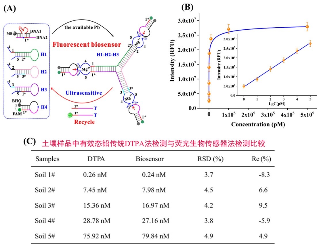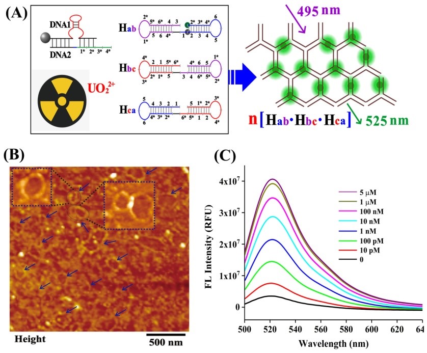 创新性地以双茎环DNA探针为自组装元件,当反应体系中存在待检重金属(以铀离子为例),释放的核酸片段可激活DNA组装,经过多重循环的核酸杂交及链置换反应,形成一种DNA网状纳米结构的荧光生物传感器。该荧光生物传感器对铀离子的检测线性范围为10 pM到1 mM,检测限为2 pM,能实现对土壤样品中痕量铀污染的超灵敏检测。该荧光生物传感器操作简单,响应迅速,信号扩增效率高效,为土壤重金属的超灵敏检测提供了一种新方法。