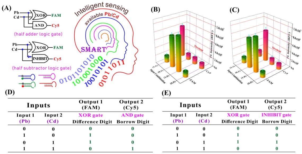 图2.(A)分子逻辑门生物传感器用于有效态重金属的智能化检测。(B)半加器分子逻辑门生物传感器结果。(C)半减器分子逻辑门生物传感器结果。(D)半加器分子逻辑运算真值表。(E)半减器分子逻辑运算真值表。