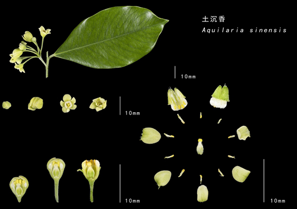 沉香为沉香属植物遇到损伤或真菌侵染时产生的含树脂木材,芳香油脂主要存在韧皮部中。沉香形成时间漫长,导致产量低,供不应求。因此,沉香属植物野外种群数量急剧下降,目前受到《濒危动植物种国际贸易公约》(CITES)和《国际自然保护联盟红色名录》(IUCN)的保护,限制其国际贸易。自20世纪90年代起,内生真菌就作为接种剂用于人工诱导结香。沉香属现有21个种,主要分布于东南亚地区。我国有两种沉香属植物,土沉香A. sinensis和云南沉香A. yunnanensis。土沉香分布于海南、广西、广东、福建、台湾等地,喜生于低海拔的山地、丘陵以及路边阳处疏林中。云南沉香产云南西双版纳及临沧地区,生于海拔1200米的杂木林下或沟谷疏林中。在昆明植物园的观叶观果园内,还栽种着一种名为云南土沉香Excoecaria acerifolia的植物,虽然名字中带有“土沉香”三个字,但它是大戟科Euphorbiaceae海漆属Excoecaria的木本植物,与产沉香的沉香属没有亲缘关系。
