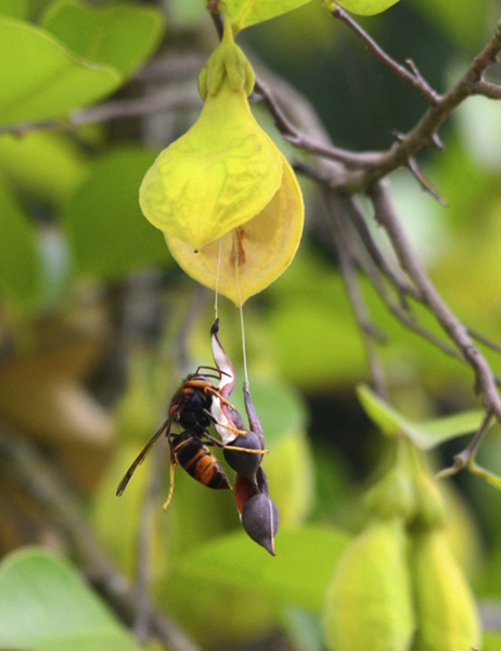 黑胸胡蜂Vespa vultina正撕扯土沉香种子上的附属物,引自:Rod Peakall&Björn Bohman,2022
