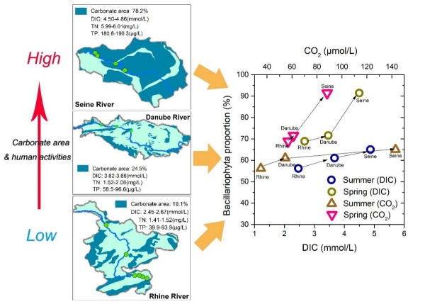 针对以上科学问题,中国科学院地球化学研究所环境地球化学国家重点实验室刘再华研究员领导的喀斯特水-碳循环研究小组联合西南大学,与德国卡尔斯鲁厄理工大学Nico Goldscheider教授领导的研究团队开展了国际合作研究,对欧洲三条主要河流——莱茵河、多瑙河和塞纳河的生物地球化学变化进行了比较研究,揭示了不同碳酸盐出露面积和人类影响(农业活动和污水输入)对流动水系统限制性营养盐和浮游植物群落组成变化的影响。研究发现,莱茵河和多瑙河由于上个世纪以来进行了流域的水质管理,其硝酸盐负荷(4.04–6.45 mg/L)较低,因此表现为氮限制。塞纳河流域的碳酸盐岩分布最为广泛,占流域面积的78.2%,因此其HCO3-的浓度最高(~4.68 mmol/L)。但由于塞纳河流域内密集的农业活动和城市污水输入,其硝酸盐浓度在三个流域中最高(~19.38 mg/L)。此时,流域无机碳的输入反而满足不了高氮浓度引起的初级生产力增加导致的碳需求,因此表现为C限制。结果表明,塞纳河的初级生产力(叶绿素-a浓度)与溶解无机碳(DIC)浓度呈现显著相关(R2=0.68,P<0.05)。此外,研究结果进一步表明流域的水体DIC含量变化还可以显著改变水体浮游植物的优势种类。在塞纳河,DIC和CO2(aq)的浓度高,导致其硅藻含量高于莱茵河和多瑙河(雨季高3.96–8.81%,旱季高19.87–22.56%)。这是浮游植物种间碳浓缩机制(CCMs)效率的差异决定的,硅藻的CCM机制效率低,在DIC和CO2(aq)浓度高的水体更易占据竞争优势。我们的研究结果表明,为了缓解河流富营养化和改善水生环境质量,在未来流动水系统的水碳管理上应考虑碳限制的影响,以减少有害藻类的潜在影响。
