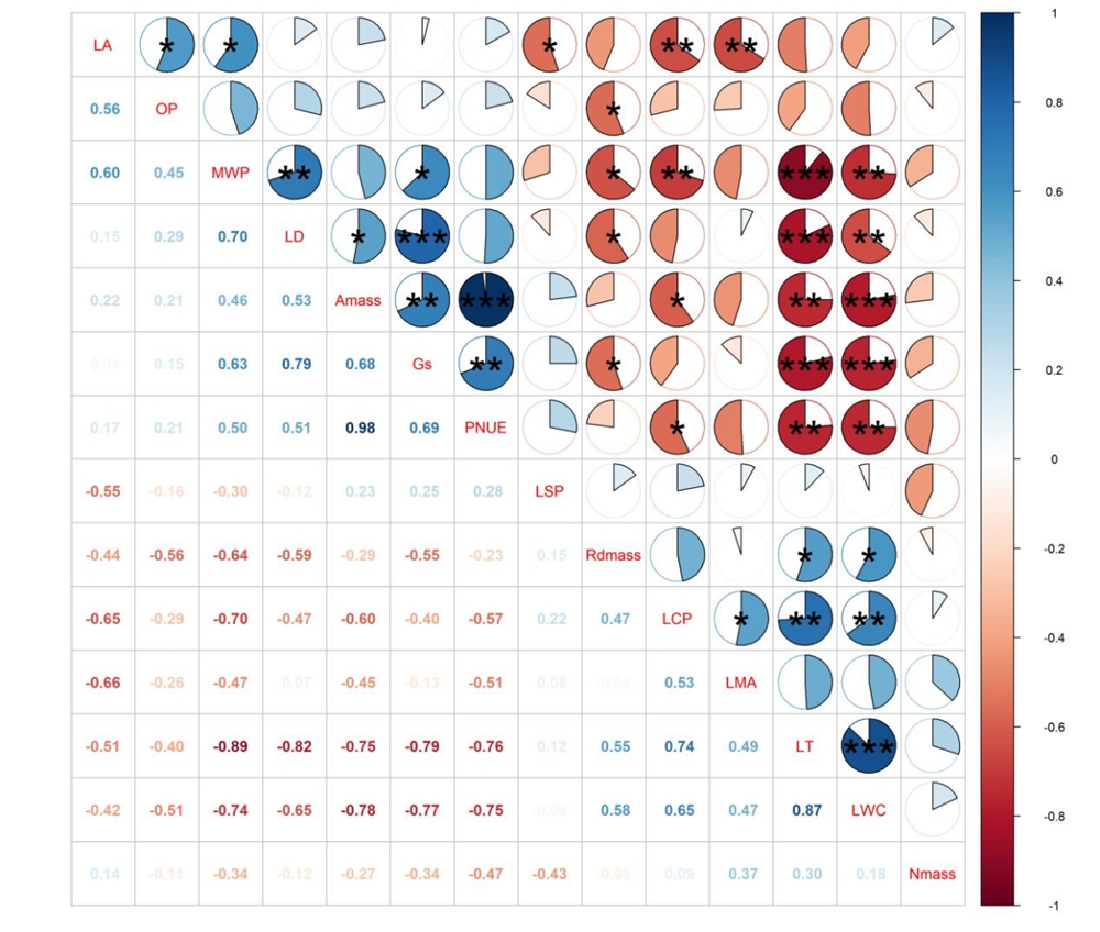 图2:望天树不同类型叶片功能性状之间的相关性