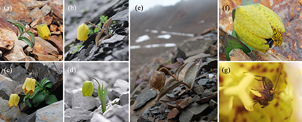 图1 不同花色的梭砂贝母及其传粉者。(a-d)黄花群体;(e)花伪装群体;(f)熊蜂访问黄花群体的梭砂贝母;(g)花蝇访问伪装群体的梭砂贝母。