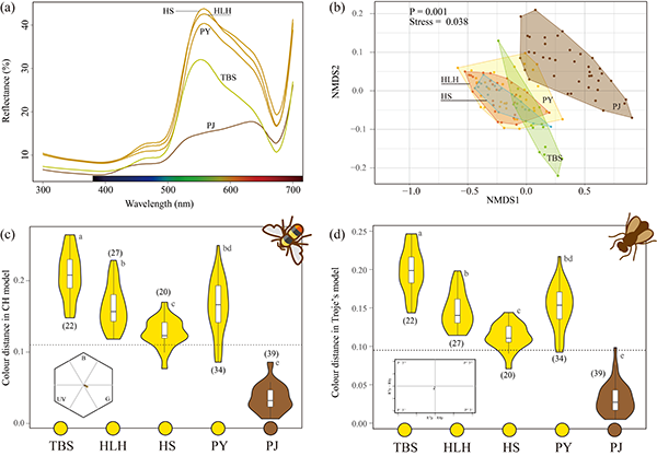 图4 不同群体的花色特征。(a)花的平均反射光谱;(b)不同群体间反射光谱的分化;(c)蜂的色彩六边形模型中花与石头之间的色彩距离。(d) Troje苍蝇色彩模型中花与石头之间的颜色距离。