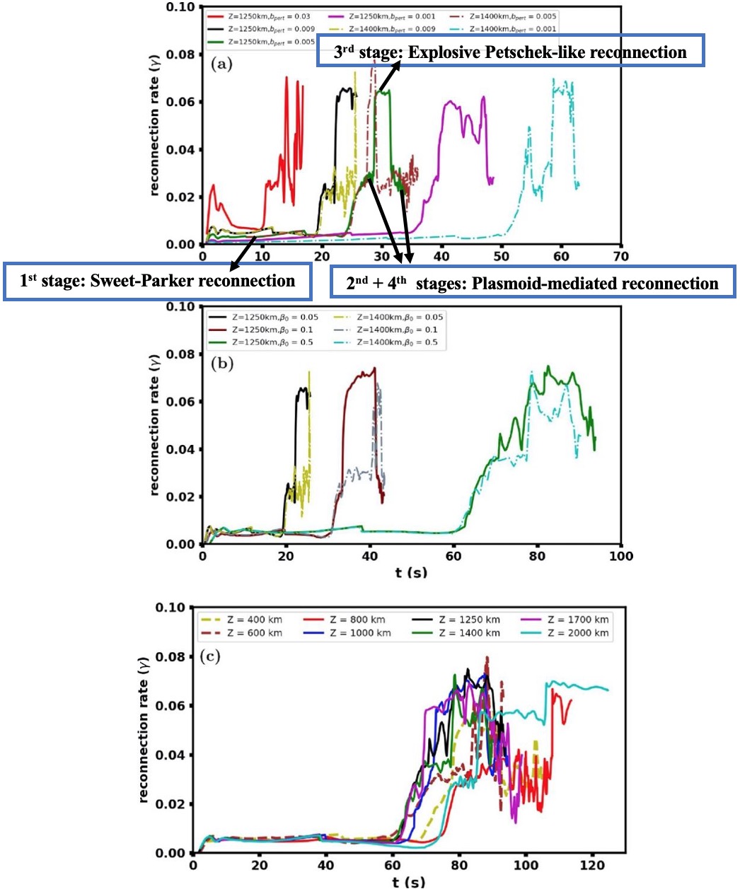 图1:磁重联速率随时间的演化:(a) 对于不同的初始磁扰动和相同的初始等离子体-β;(b) 对于不同的初始等离子体-β和相同的磁扰动;(c) 从光球到色球顶部,在相同的初始等离子体-β和相同的磁扰动条件下,在不同高度上的变化。