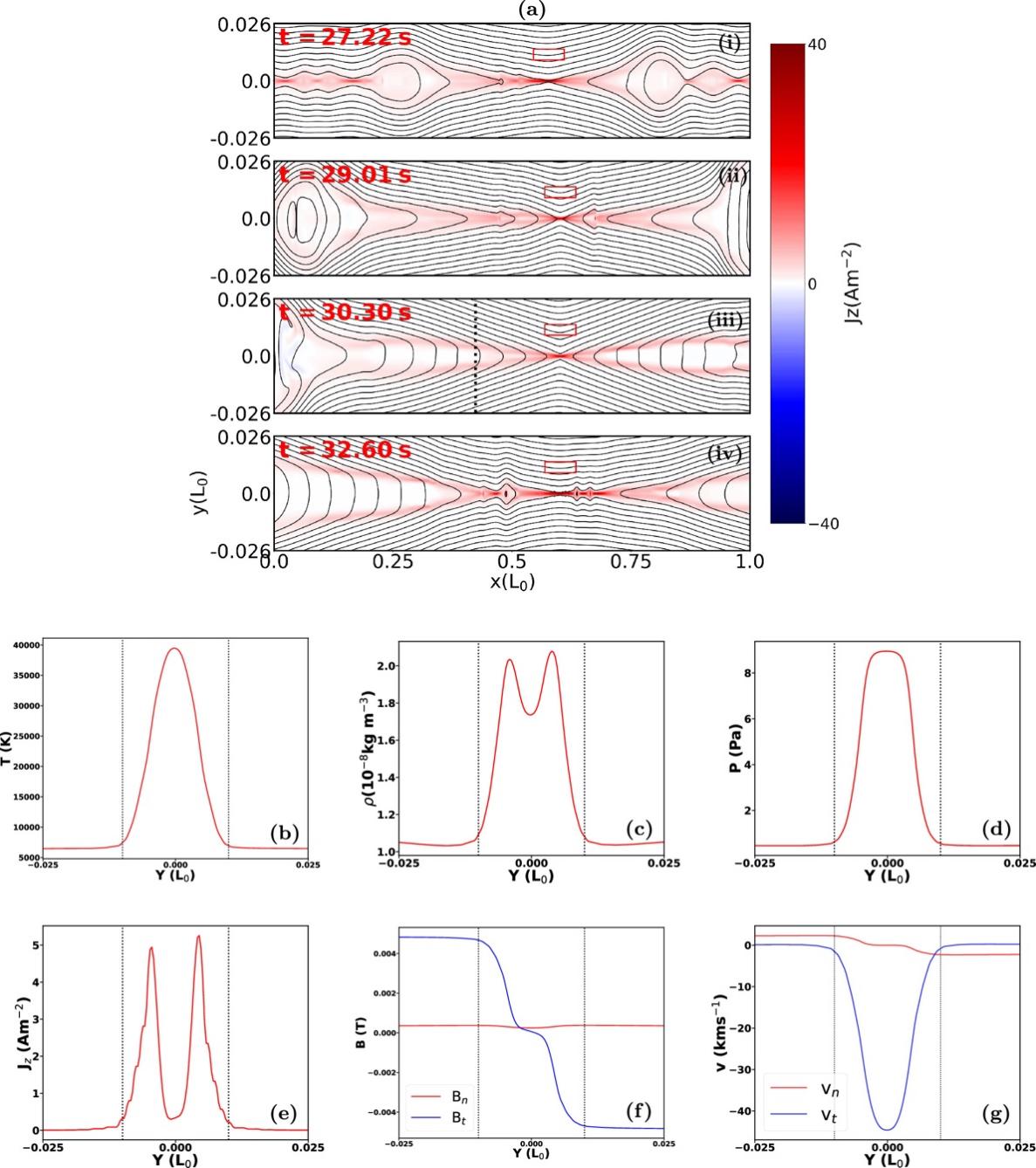 图2:(a) 在一个典型的模拟案例中,四个不同时间点的磁场(实线)和电流密度Jz(背景颜色)的二维分布;(b)-(g) 图展示的是a(iii)中沿着垂直黑色点线上多个物理量的分布图。黑色垂直点线穿过电流片左侧的一对慢模激波的波前。