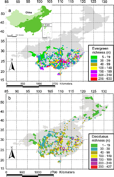 图1 中国湿润、半湿润地区常绿和落叶木本双子叶植物丰富度的地理分布