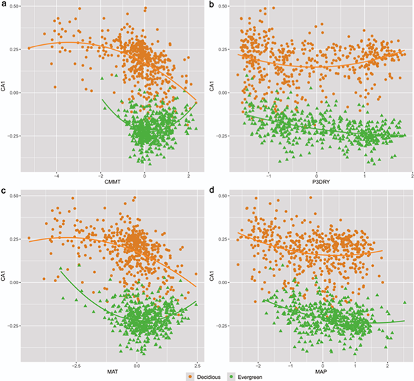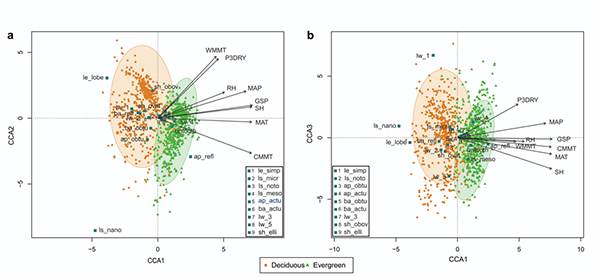 图3 常绿和落叶植物叶相特征与气候的典范对应分析(Canonical correspondence analysis,CCA)