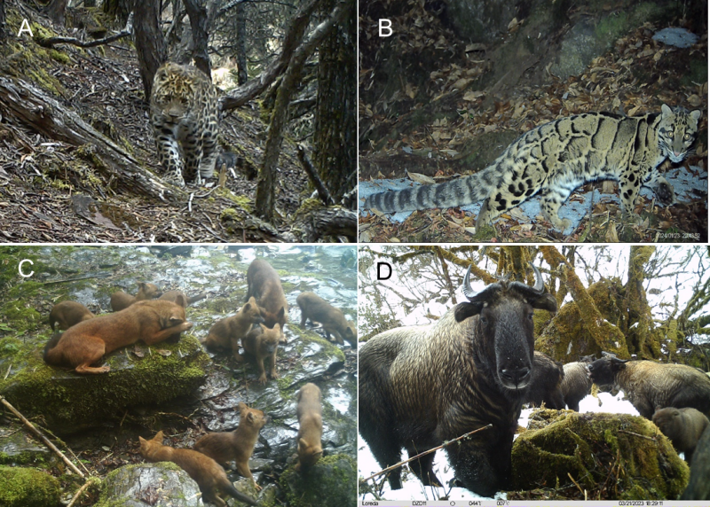 自2017年以来,为评估区域野生动物多样性和人类活动的影响,研究团队在高黎贡地区建立了28个红外相机监测样地。共布设相机695台,累计监测时长467,509天,记录到102,012条独立有效事件(同一台相机1小时内拍摄到的野生动物或人类活动)。监测到大中型兽类66种、雉类16种,其中包括如豹Panthera pardus、云豹Neofelis nebulosa、豺Cuon alpinus和喜马拉雅扭角羚Budorcas taxicolor等55种国家重点保护动物(图1)。