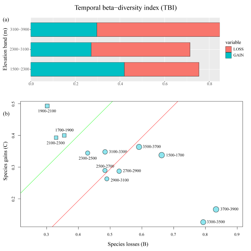 图2 雨季到干季时间β多样性:a)以800 m为梯度的3个海拔带;b)以200 m 为梯度的12 个海拔带。绿线表示物种增加和减少之间的平衡,红线与所有海拔带的质心相交。绿线下方位置表示,从雨季到干季,平均物种减少超过物种增加。符号大小表示时间β多样性指数的相对值。圆(n = 9)表示物种减少为主的海拔带,方(n = 3)表示物种增加为主的海拔带。