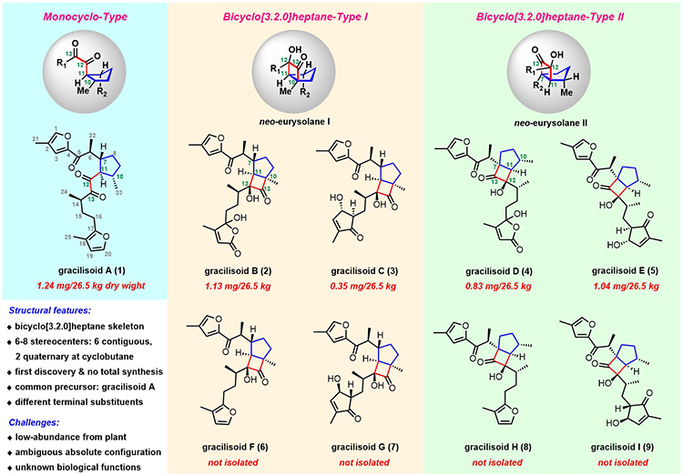 二倍半萜(Sesterterpenoids)由5个异戊二烯单元组成,是萜类天然产物中数量最少的一个亚类,其结构新颖复杂、生物活性广泛,目前全世界仅报道了1400余个,绝大多数来源于海洋生物,而植物来源的二倍半萜仅有约200个。中国科学院昆明植物研究所植物化学与天然药物全国重点实验室黎胜红研究团队长期致力于新颖结构植物二倍半萜天然产物的发现、生物功能、生物合成、结构修饰与化学合成及创新药物研究(Angew. Chem. Int. Ed. 2010, 49,4471; Angew. Chem. Int. Ed. 2021, 60,25468; Plant Cell 2016, 28,804; Adv. Sci. 2025,2415370; Nat. Prod. Rep. 2021, 38,2293; Plant Commun. 2021, 2,100233; J. Med. Chem. 2024, 67,513; Org. Lett. 2011, 13,1864; Org. Lett. 2012, 14,5768; Org. Lett. 2013, 15,1694; Org. Lett. 2014, 16,6416; Org. Lett. 2021, 23,2232; Org. Chem. Front. 2022, 9,2209; J. Org. Chem. 2020, 85,5511; J. Org. Chem. 2021, 86,11169; J. Org. Chem. 2024, 89,3652; Chem. Commun. 2024, 60,10512)。近日,研究团队从唇形科单种属药用植物宽管花(Eurysolen gracilis)中首次发现一类具有新颖双环[3.2.0]庚烷核心骨架的微量二倍半萜,并基于生源启发的光化学反应完成该家族9个二倍半萜的集群式不对称全合成,在此基础上发现该类独特天然产物的免疫抑制活性。