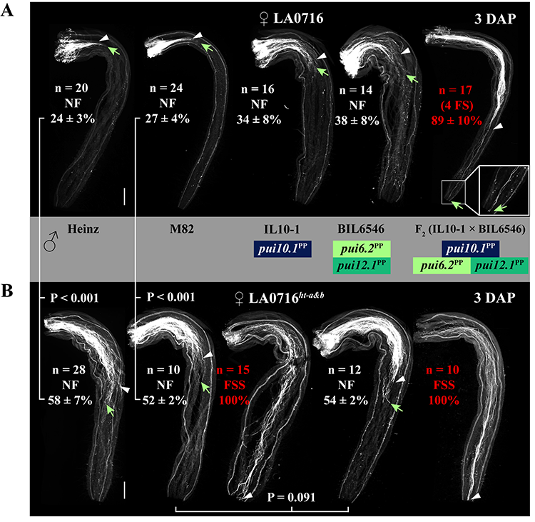 种间单向不亲和(unilateral incompatible,UI)反应广泛存在于栽培番茄与野生番茄之间。以野生潘那利番茄LA0716和栽培番茄Heinz为例:LA0716和Heinz均自交亲和(图1);它们之间的种间授粉表现出单向不亲和反应:Heinz花粉对LA0716花柱授粉后,花粉管在花柱中停止生长;而LA0716的花粉对Heinz花柱授粉,花粉管可以正常生长并产生种子(图1)。基于这些观察,研究人员提出以下假设:1)LA0716的花粉和花柱分别表达若干单向不亲和(UI)花柱因子和花粉因子,它们之间是拮抗关系——即LA0716的UI花粉因子成功拮抗LA0716的UI花柱因子,保障了LA0716自交亲和;2)LA0716中的UI花粉和花柱因子在Heinz的花粉和花柱中功能减弱或者失去功能,导致Heinz也表现为自交亲和;3)当强功能的UI花粉因子碰到弱/无功能的UI花柱因子(例如 ♀Heinz × LA0716♂),花粉管正常生长并完成受精,此方向的种间杂交亲和;4)当弱/无功能的UI花粉因子碰到强功能的UI花柱因子(例如 ♀LA0716 × Heinz♂),上述的拮抗互作失败,导致花粉管生长受到UI花柱因子抑制,表现出不亲和反应(图1)。UI反应既阻碍了种间杂交育种的推进,也限制了研究者对野生资源优良性状的筛选和调控位点的鉴定。因此,挖掘调控UI反应的花柱和花粉效应因子,对于打破栽培番茄和野生番茄的种间生殖壁垒具有重要的理论和实践指导意义。