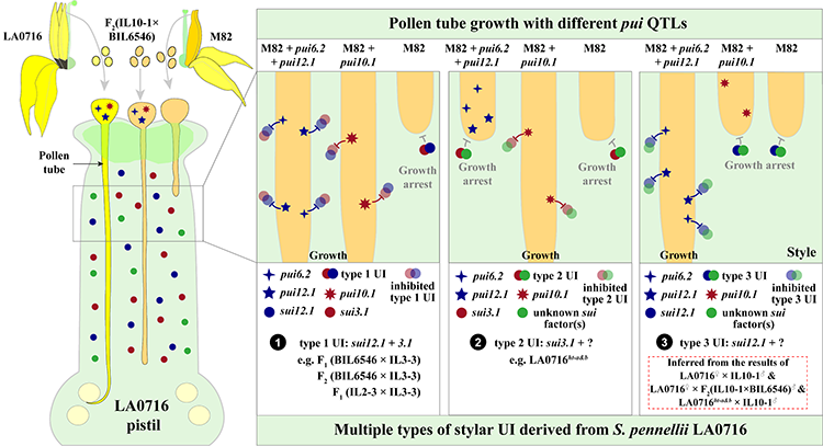 LA0716的UI反应由花粉端和花柱端表达的遗传因子(pollen UI,pui和style UI,sui)共同调控,二者通过复杂的互作网络,在拒绝栽培番茄花粉管的同时维持着LA0716的自交亲和性。前人通过正向遗传学研究在解析pui和sui位点互作调控关系上存在一定的局限性。与以往研究不同,郭晗团队在证实pui6.2和pui12.1位点功能的同时,通过对渗入系材料进行杂交,构建了多种番茄遗传材料,系统地解析了LA0716的UI反应中pui位点间、sui位点间以及pui与sui位点间的互作关系。该研究对近十年来该领域的工作进行了一定的整合,搭建了单向不亲和位点之间的功能框架,为后续的分子机制研究奠定基础。