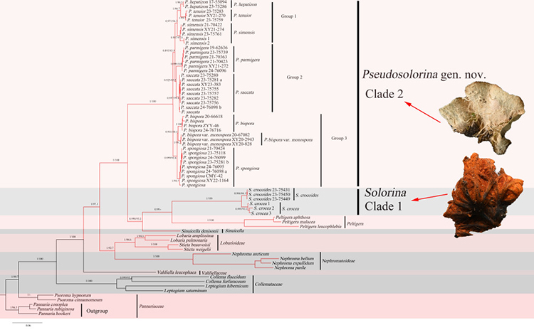 图1. 基于nrITS、nrLSU和mtSSU的地卷目(Peltigerales)系统发育树。红色标识的分支为地卷科(Peltigeraceae),扁盘衣在该科下形成了独立的分化支。