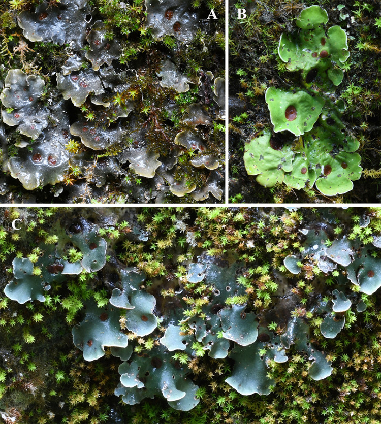 图2.扁盘衣新种野外生境图片:A. 褐肝扁盘衣Pseudosolorina hepatizon,B. 盾形扁盘衣P. parmigera(模式种),C. 薄叶扁盘衣P. tenuior。
