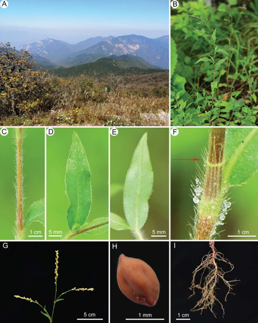 图2 甄氏蓼 A.生境;B.植株形态;C.茎;D-E.叶片;F.托叶鞘;G.花序;H.瘦果;I.根