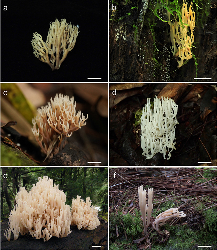 图1 分布于高黎贡山及其周边地区的密瑚菌属Artomyces物种。(a) 褐白密瑚菌A. brunneoalbus; (b) 毛脚密瑚菌A. hirtipes; (c) 羽瑚菌状密瑚菌A. pteruloides; (d) 雪白密瑚菌A. niveus; (e) 杯密瑚菌A. pyxidatus; (f) 云南密瑚菌A. yunnanensis。比例尺为1cm