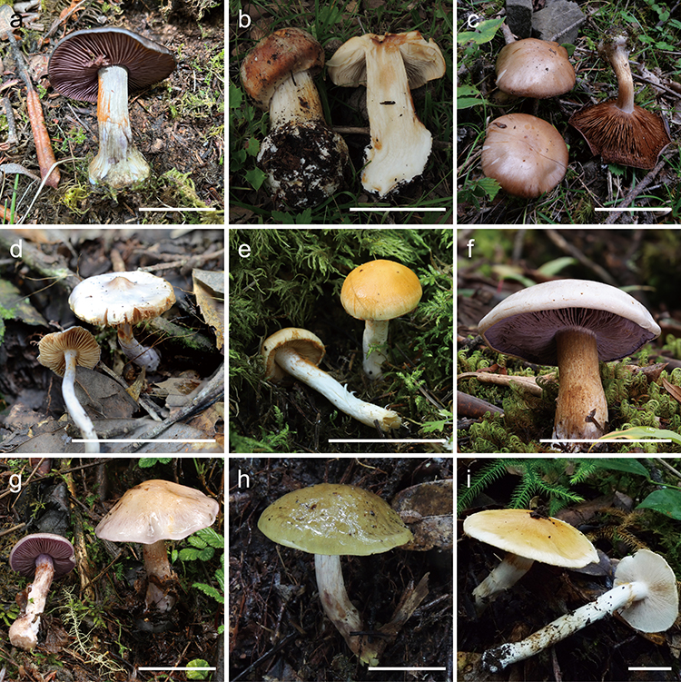 图2 分布于高黎贡山及其周边地区的萨氏丝膜菌属Thaxterogaster物种。(a) 黑盖萨氏丝膜菌 T. atricapitatus; (b) 粗柄多形萨氏丝膜菌 T . crassimultiformis; (c) 铜色萨氏丝膜菌 T. cupreus; (d) 小白萨氏丝膜菌 T. alboparvus; (e) 黄盖萨氏丝膜菌 T. flavocapitatus; (f) 薰紫萨氏丝膜菌 T. lavendulaceus; (g) 淡紫萨氏丝膜菌 T. pallidopurpurascens; (h) 污盖萨氏丝膜菌 T. sordidus; (i) 细柄萨氏丝膜菌 T. tenuipes。比例尺为5cm