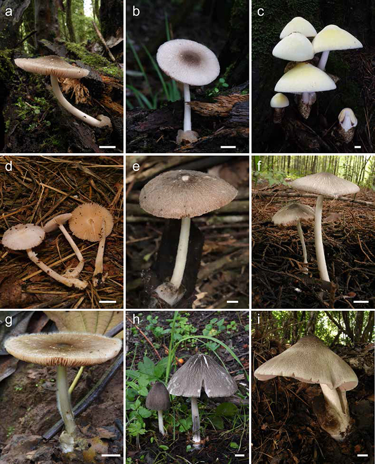 图3 分布于高黎贡山及其周边地区的草菇属Volvariella物种。(a–b) 毛盖草菇V. pilosa; (c) 银丝草菇V. bombycina; (d) 白毛草菇V. hypopithys; (e) 莫氏草菇V. morozovae; (f) 小裂盖草菇V. parvirimosa; (g) 灰褐草菇V. pulla; (h) 裂盖草菇V. rimosa; (i) 草菇V. volvacea。比例尺为1cm