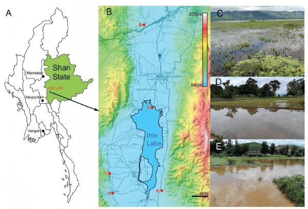 茵莱湖位于缅甸掸邦高原,是中南半岛区域唯一的古湖泊,形成于约150万年前,在鱼类和淡水软体动物两个类群具有很高的多样性和特有性。茵莱湖记录有36种淡水软体动物,其中有18个特有种,然而该区域已经有近一个世纪没有任何有关于淡水软体动物等相关的调查,相关研究也仅停留在近百年前的形态和解剖学论文。