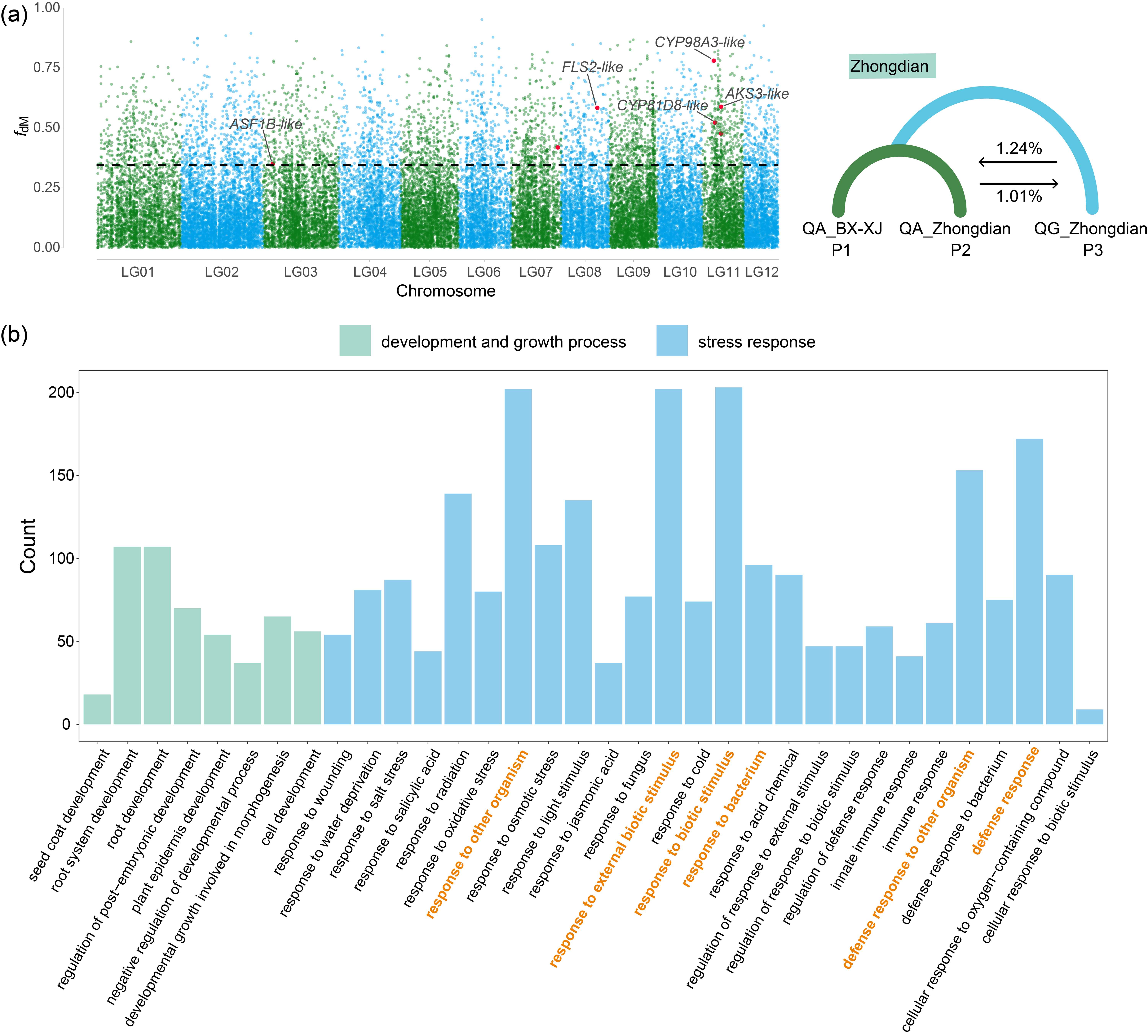 图3 川滇高山栎与帽斗栎(以中甸为例)渐渗的基因组景观(a)及候选渐渗基因的潜在功能(b)